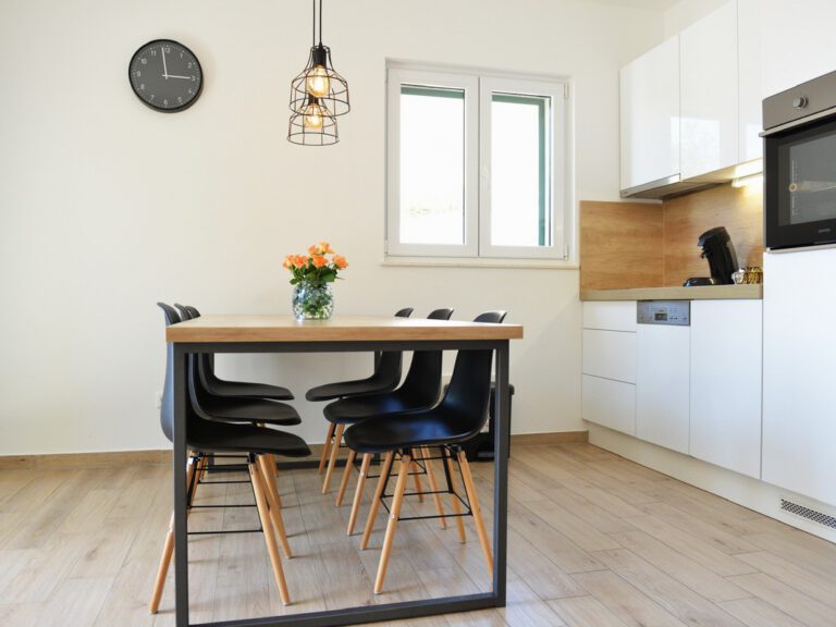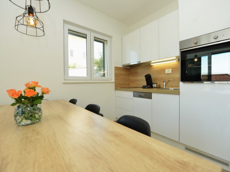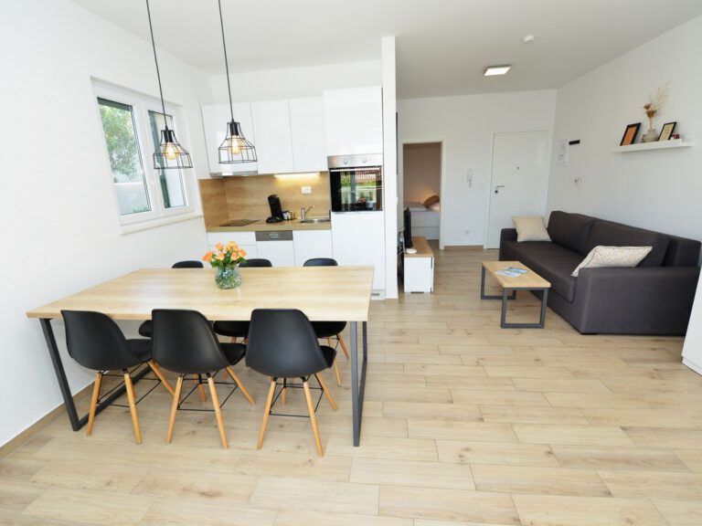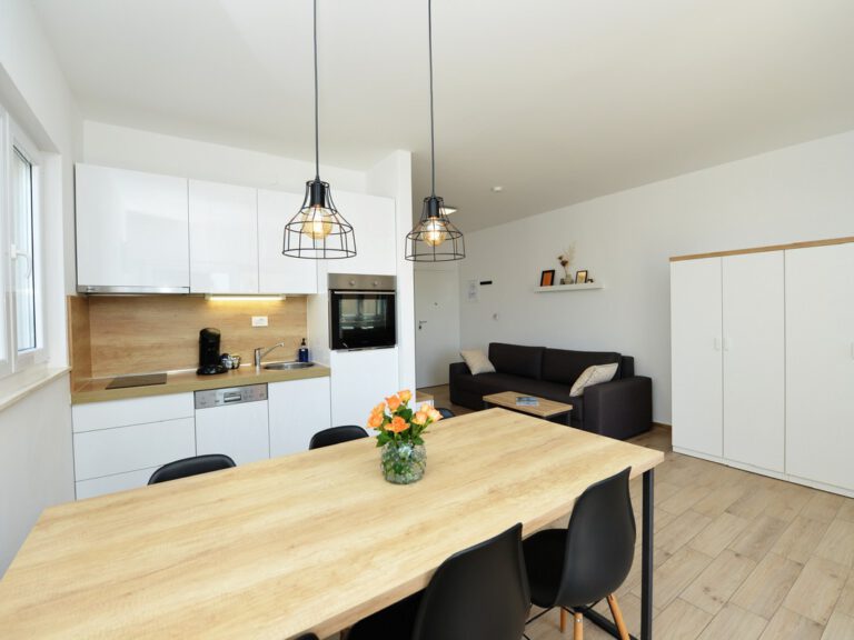 - Küchenzeile: Backofen, Kochplatten, Kühlschrank mit Gefrierfach, Spülmaschine, Kaffeemaschine, Wasserkocher, Küchenutensilien